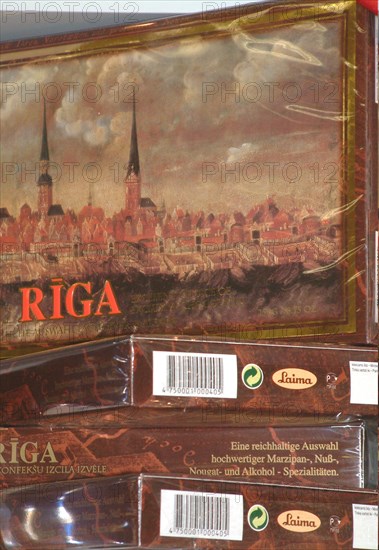 Packages of laima chocolates from riga, latvia.