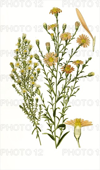 Aster multiflorus, turbinellus, Michaelmas Daisy. Aster, digital improved reproduction from a print of the 19th century