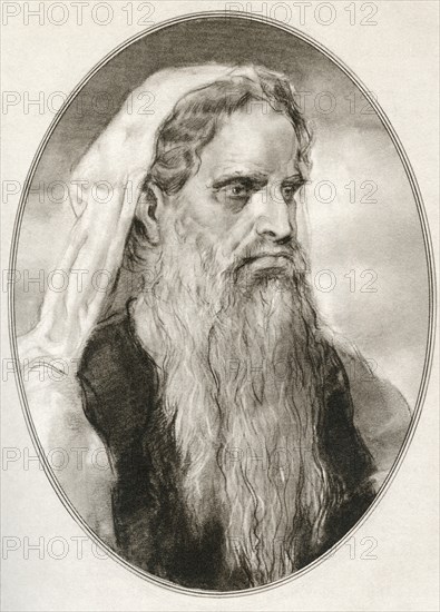 Moses, a prophet in the Abrahamic religions, leader of the Israelites and lawgiver. Illustration by Gordon Ross, American artist and illustrator (1873-1946), from Living Biographies of Religious Leaders.