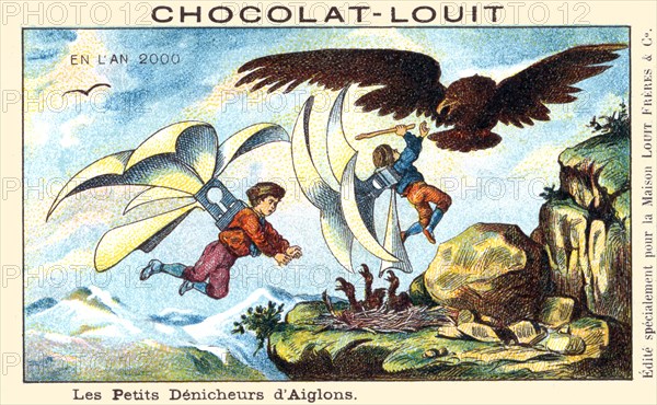 The Small Eagle Finders. Two boys try to rob an eagles nest using personal flying wings. In 1900, a French illsutrator, Jean Marc Cote, created a series of images of how they envisioned life in the year 2000 (En l'an 2000) would look like. This images were available on postcards and premiums from snacks like chocolate..