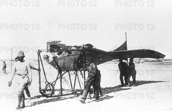 A plane after an accident, is transported in workshops camp in Libya, 1912