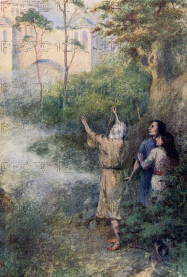 The caption for this illustration reads: On that spot instantly rose a beautiful palace. The tale tells of three brothers who had only a pear tree. God sent an angel and each brother gave the angel (in disguise) pears. The angel then granted each youth a wish. One wanted the river to turn to wine, The second wnated all the doves to become sheep. The third wanted a true Christian wife. The angel helped th eyouth win a princess. The angel returned but was refused wine by the first brother and cheese by the second. The third and his wife, very poor, offered whatever they had, In return the angel chnaged their bark to bread and their water to wine He then chnaged their hut to a palace, as sen here. The illustration is from a 1921 book on Serbian myths and legends.