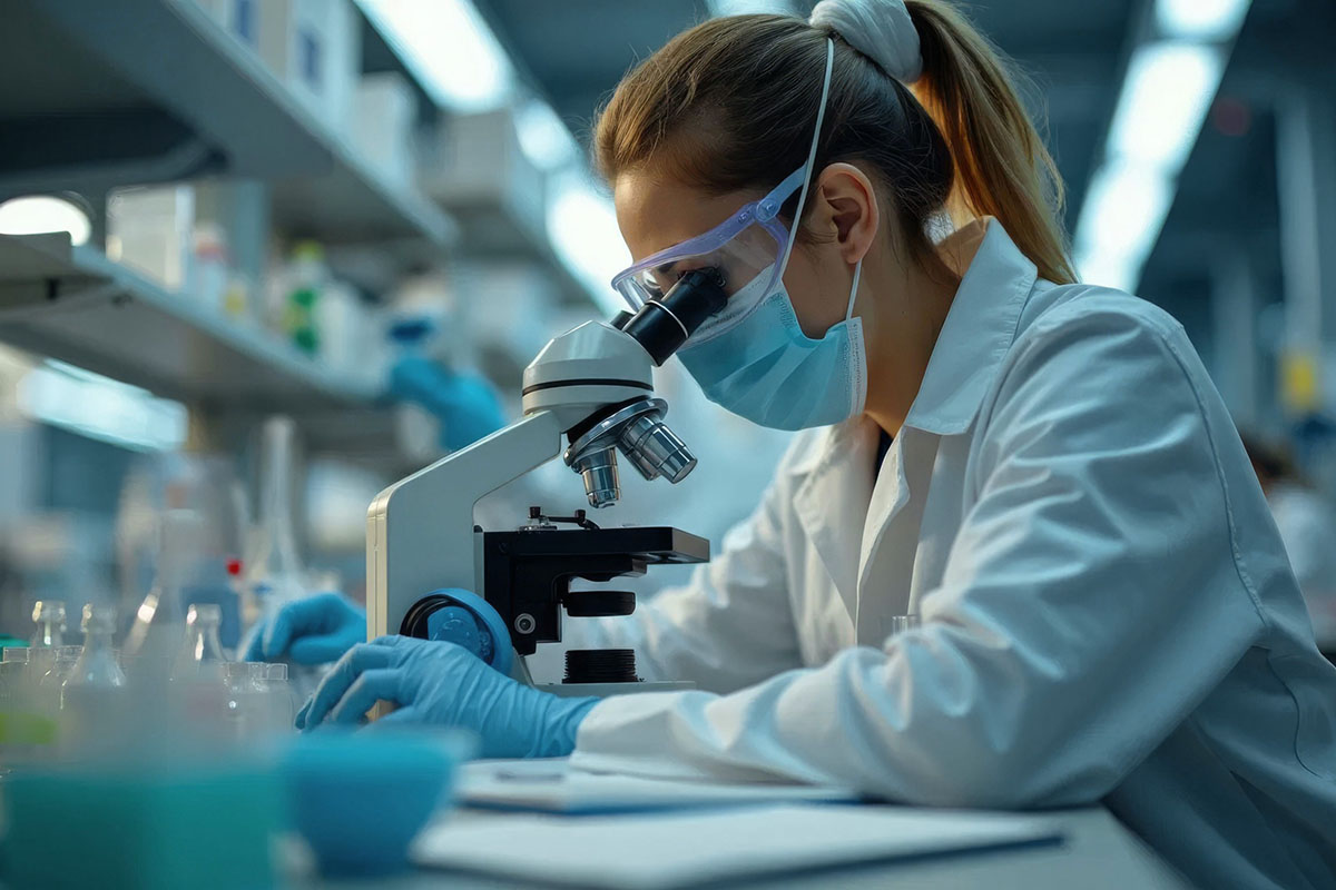 Chercheuse observant un échantillon au microscope dans un laboratoire. Image d'illustration. 2025. Photo12/Alamy