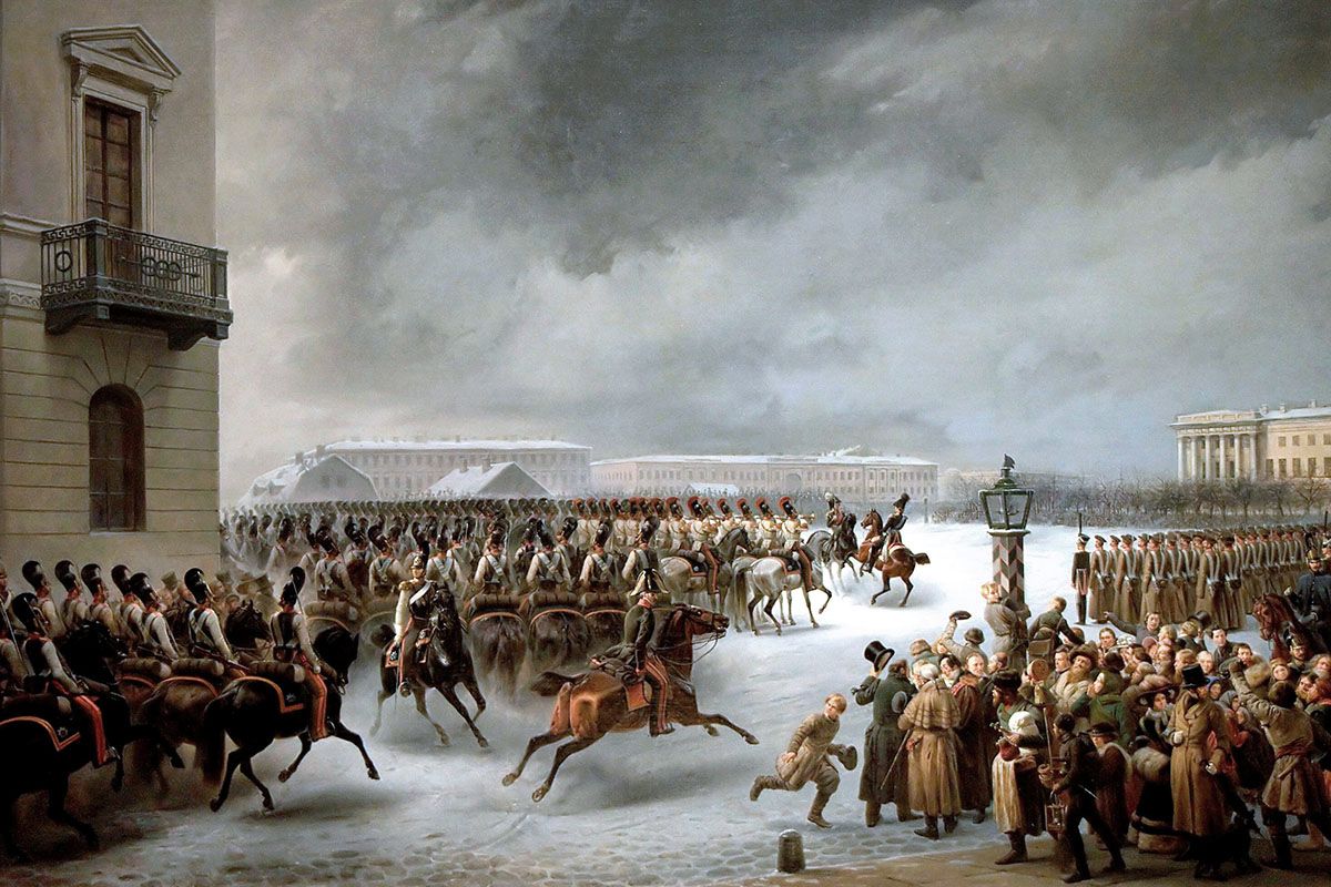 La révolte décembriste sur la place du Sénat, le 14 décembre 1825. Huile sur toile de Vasily Timm datée de 1853 et conservée au musée de l'Ermitage à Saint-Pétersbourg. Photo12/Alamy