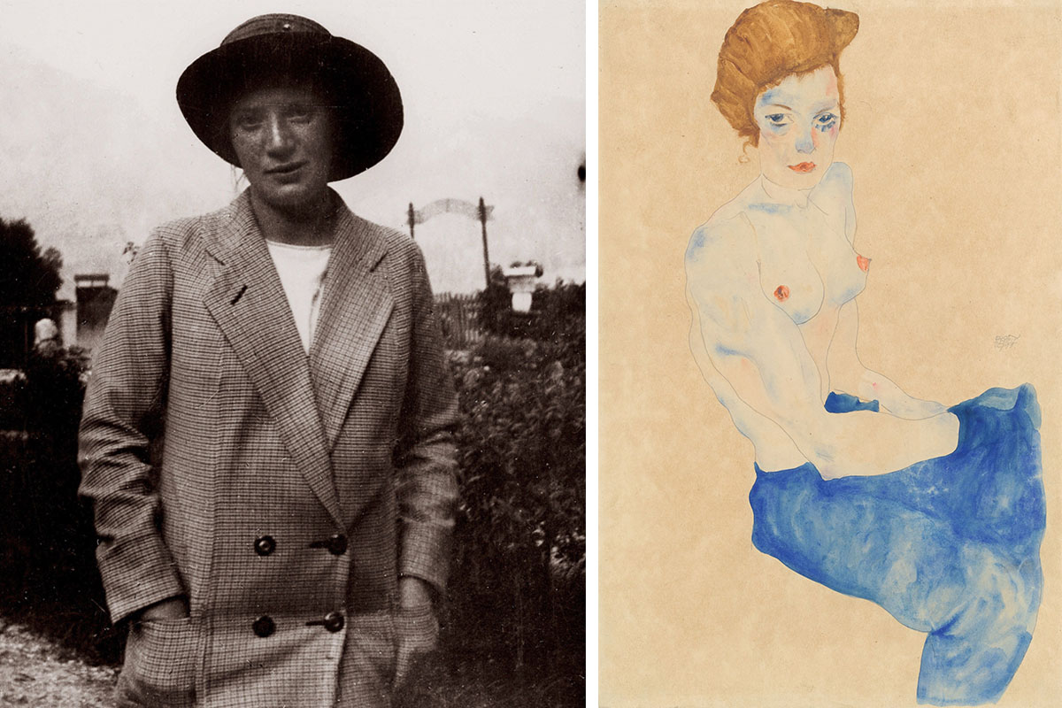 A gauche : Portrait de Wally Neuzil en 1913. A droite : Nu bleu assis, peint par Schiele en 1911 et conservé au musée des beaux-arts de La Hague. Crédit : Photo12/Ullstein Bild et Photo12/Heritage Images