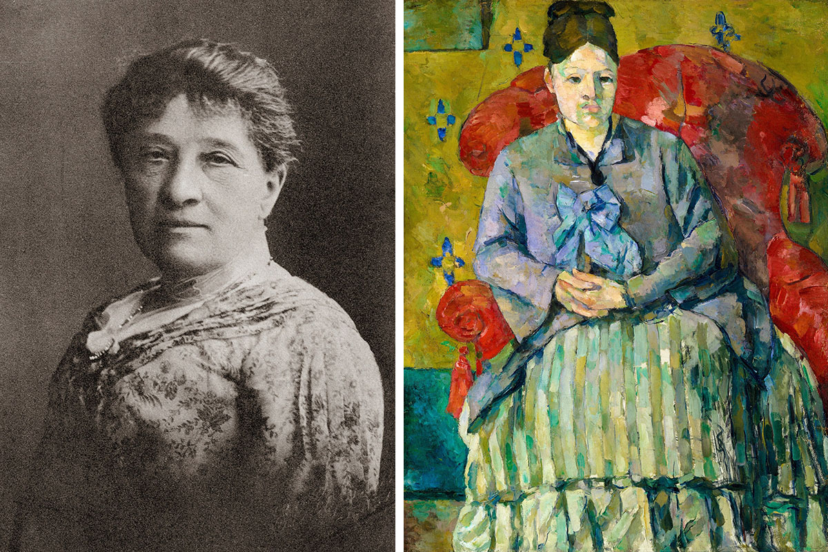 A gauche : Photographie de Marie-Hortense Fiquet Cézanne vers 1900. A droite : Madame Cézanne dans un fauteuil rouge, peint par Cézanne en 1877 et conservé au musée des beaux-arts de Boston. Crédits : Photo12/Alamy