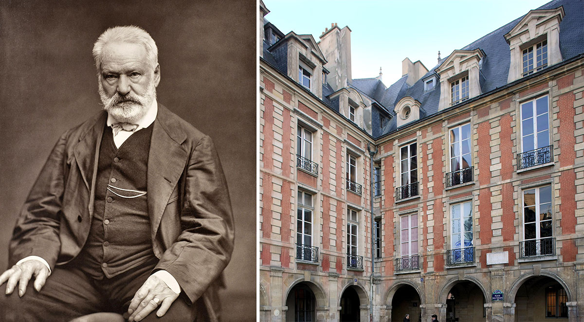 A gauche : Portrait de Victor Hugo en 1876. A droite : Maison de Victor Hugo Place des Vosges à Paris (4e). Crédit : Photo12/Alamy/Niday Picture Library et Gilles Targat/Photo12